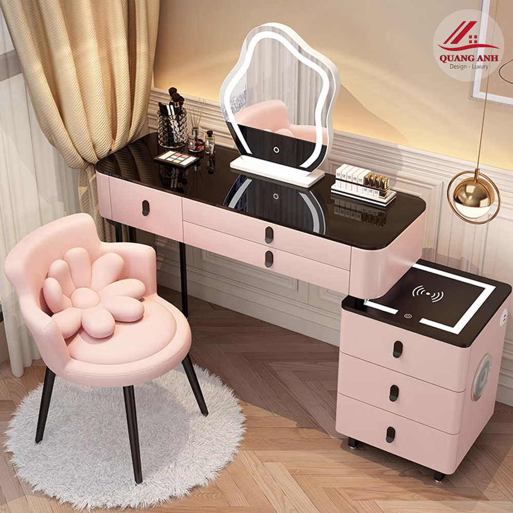 Mẫu bàn trang điểm hồng pastel gương LED mang đến vẻ đẹp hiện đại, dễ thương và tiện ích cho không gian phòng ngủ. Với gam màu hồng pastel ngọt ngào kết hợp mặt bàn kính đen sang trọng và gương LED viền uốn lượn độc đáo, sản phẩm không chỉ giúp tối ưu công năng mà còn tạo điểm nhấn nổi bật cho căn phòng.