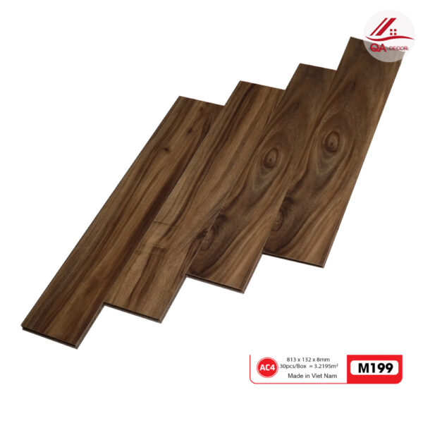 - Thiết kế bản nhỏ, dễ dàng lắp đặt: Sàn M199 có kích thước bản nhỏ truyền thống giúp việc thi công trở nên đơn giản, đặc biệt là trong các không gian có nhiều chi tiết nội thất hoặc diện tích hạn chế. Hèm khóa thông minh giúp các tấm sàn khớp chặt với nhau mà không cần dùng keo, dễ tháo lắp khi cần bảo trì hoặc di dời.