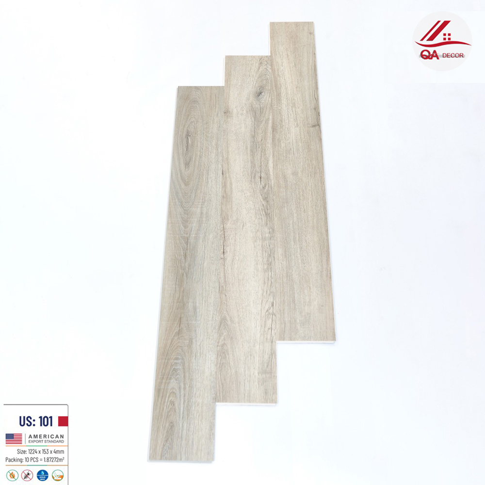 Sàn Nhựa Đế Cao Su Glotex 4mm – US101 là mẫu sàn nhựa cao cấp sở hữu tông màu ghi be sáng nhẹ nhàng, vân gỗ tự nhiên sắc nét, mang lại nét đẹp hiện đại, thanh thoát cho mọi không gian sống. Cấu tạo dày 4mm, tích hợp lớp đế cao su tiêu âm 1mm giúp giảm tiếng ồn hiệu quả, tăng độ êm chân khi di chuyển và chống ẩm mốc tốt. Sản phẩm sản xuất từ nhựa nguyên sinh kết hợp bột đá SPC mật độ cao, bề mặt phủ lớp chống trầy nhẹ, đảm bảo độ bền và thẩm mỹ lâu dài cho công trình.