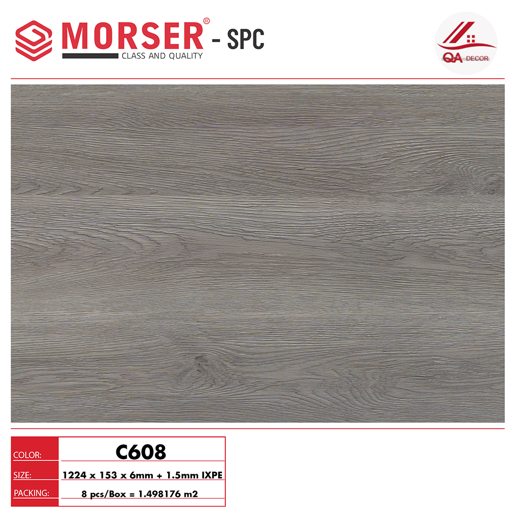 Sàn Nhựa Morser 6mm – C608 là mẫu sàn nhựa cao cấp với tông màu ghi xám trung tính, vân gỗ nổi rõ, mang đến vẻ đẹp hiện đại, sang trọng và đầy cá tính cho không gian nội thất. Đây là mẫu sàn lý tưởng cho các thiết kế phong cách Industrial (công nghiệp), Scandinavian, Minimalism hoặc các không gian nghệ thuật, showroom, studio. Cấu tạo sàn dày 6mm (cốt SPC 5mm + đế cao su IXPE 1.5mm), lõi nhựa nguyên sinh kết hợp bột đá SPC mật độ cao, bề mặt phủ UV Diamond giúp chống trầy xước, chống bám bẩn và giữ màu sắc bền đẹp theo thời gian. Hèm khóa thiết kế tiện dụng giúp thi công nhanh, dễ vệ sinh và bảo trì.