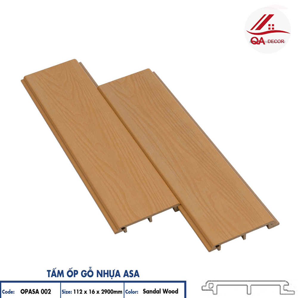 Tấm ốp gỗ nhựa phủ ASA Hobi Wood – OPASA 002 là dòng vật liệu cao cấp được thiết kế dành riêng cho các công trình cần độ bền cao, khả năng chịu thời tiết tốt và tính thẩm mỹ sang trọng. Với kích thước tiêu chuẩn 112 x 16 x 2900mm, sản phẩm sở hữu màu Sandal Wood thanh lịch, bề mặt vân gỗ tinh tế cùng hệ hèm khóa âm dương giúp lắp đặt dễ dàng và liền mạch. Đây là lựa chọn lý tưởng cho các công trình ốp tường hoặc trần cả trong nhà lẫn ngoài trời.