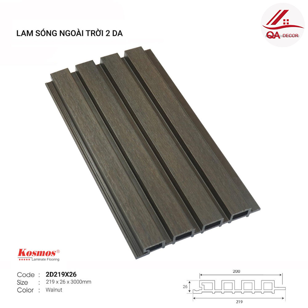 Tấm Ốp Lam Sóng Ngoài Trời – 2D219X26 là dòng vật liệu trang trí ngoại thất cao cấp đến từ thương hiệu Kosmos, nổi bật với thiết kế dạng thanh lam hình hộp đều đặn, bề mặt vân gỗ sắc sảo và màu sắc hiện đại. Sản phẩm có kích thước tiêu chuẩn 219 x 26 x 3000mm, được làm từ nhựa gỗ tổng hợp (WPC) – kết hợp giữa bột gỗ tự nhiên và nhựa Composite chất lượng cao.