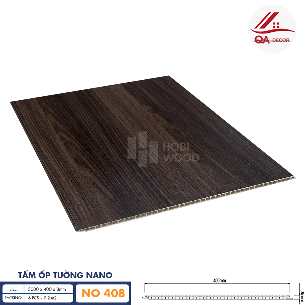 Tấm Ốp Nano Hobi Wood – NO408 nổi bật với gam màu nâu gỗ đậm cổ điển, kết hợp cùng họa tiết vân gỗ sắc sảo mang đến cảm giác sang trọng, mạnh mẽ và ấm cúng. Đây là mã màu rất được ưa chuộng trong thiết kế nội thất theo phong cách Châu Âu, cổ điển pha hiện đại. Kích thước chuẩn 3000 x 400 x 8mm, kết hợp cấu trúc rỗng giúp giảm trọng lượng, thuận tiện trong thi công và ứng dụng.