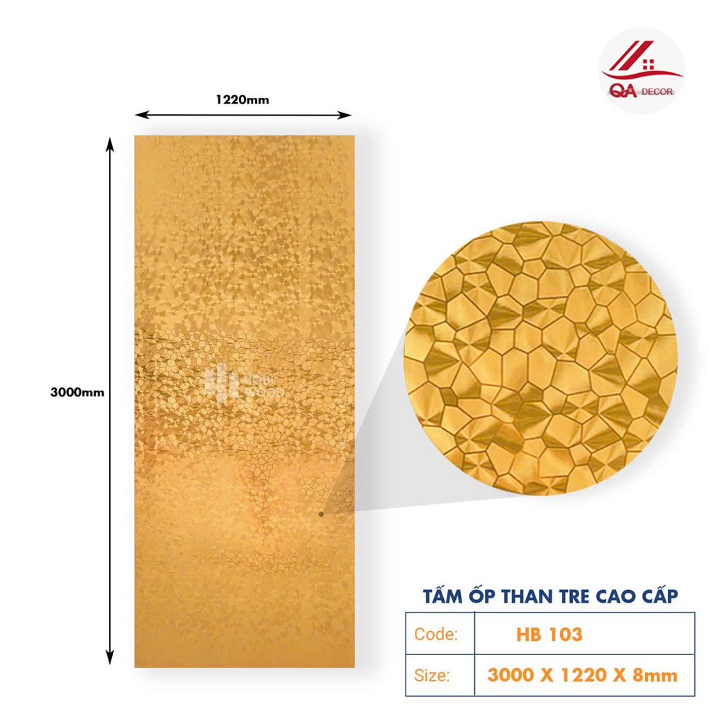 Tấm ốp than tre Hobi – HB103 gây ấn tượng mạnh với họa tiết hình khối ánh vàng lấp lánh, tạo hiệu ứng thị giác sang trọng, cá tính và đầy cuốn hút. Sản phẩm được sản xuất từ nguyên liệu than tre tự nhiên ép nhiệt cao cấp, bề mặt phủ chống trầy nhẹ, chống bám bụi, dễ vệ sinh, giữ được vẻ đẹp bền lâu. Đây là lựa chọn lý tưởng cho các không gian yêu cầu sự nổi bật, đẳng cấp và khác biệt.