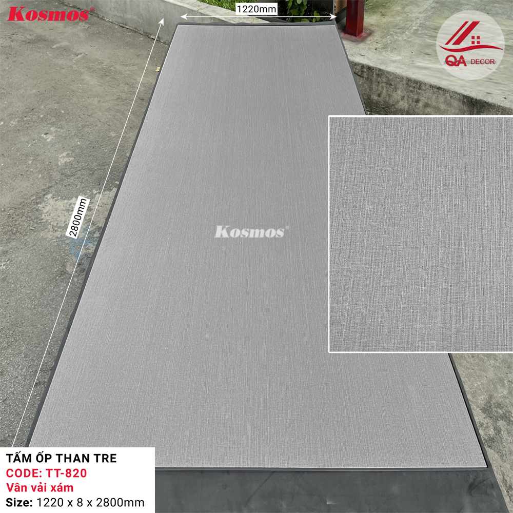 Tấm Ốp Than Tre Kosmos – TT – 820 mang thiết kế vân vải xám hiện đại, kết hợp sắc độ trung tính tinh tế – dễ phối màu với nhiều phong cách nội thất khác nhau. Hiệu ứng vân vải mềm mại tạo chiều sâu thị giác, đồng thời tạo cảm giác gần gũi, trang nhã và thanh lịch cho không gian.