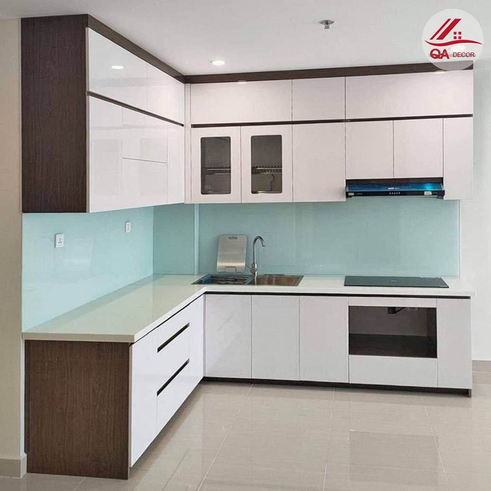 Mẫu tủ bếp gỗ công nghiệp chữ L là lựa chọn hoàn hảo cho những căn bếp cần sự tiện nghi và gọn gàng. Thiết kế ôm sát góc tường giúp tối ưu diện tích, phân chia rõ ràng khu vực nấu nướng, rửa và lưu trữ. Sự kết hợp giữa gam trắng bóng hiện đại và viền gỗ nâu tự nhiên tạo nên sự hài hòa giữa tinh tế và ấm áp. Mặt bếp đá sáng sang trọng cùng tường ốp kính xanh nhạt mang lại cảm giác thoáng sáng, trẻ trung và sạch sẽ cho không gian bếp.