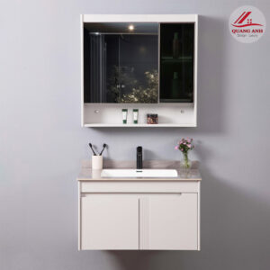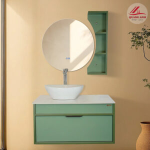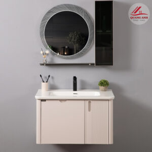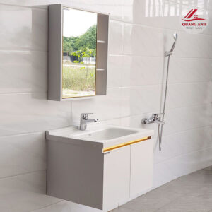 - Chất liệu cao cấp: Tủ làm từ gỗ công nghiệp chống ẩm phủ melamine hoặc nhựa PVC, bền đẹp, chống cong vênh và dễ vệ sinh. Mặt lavabo sứ trắng men bóng sáng, chống ố vàng.
